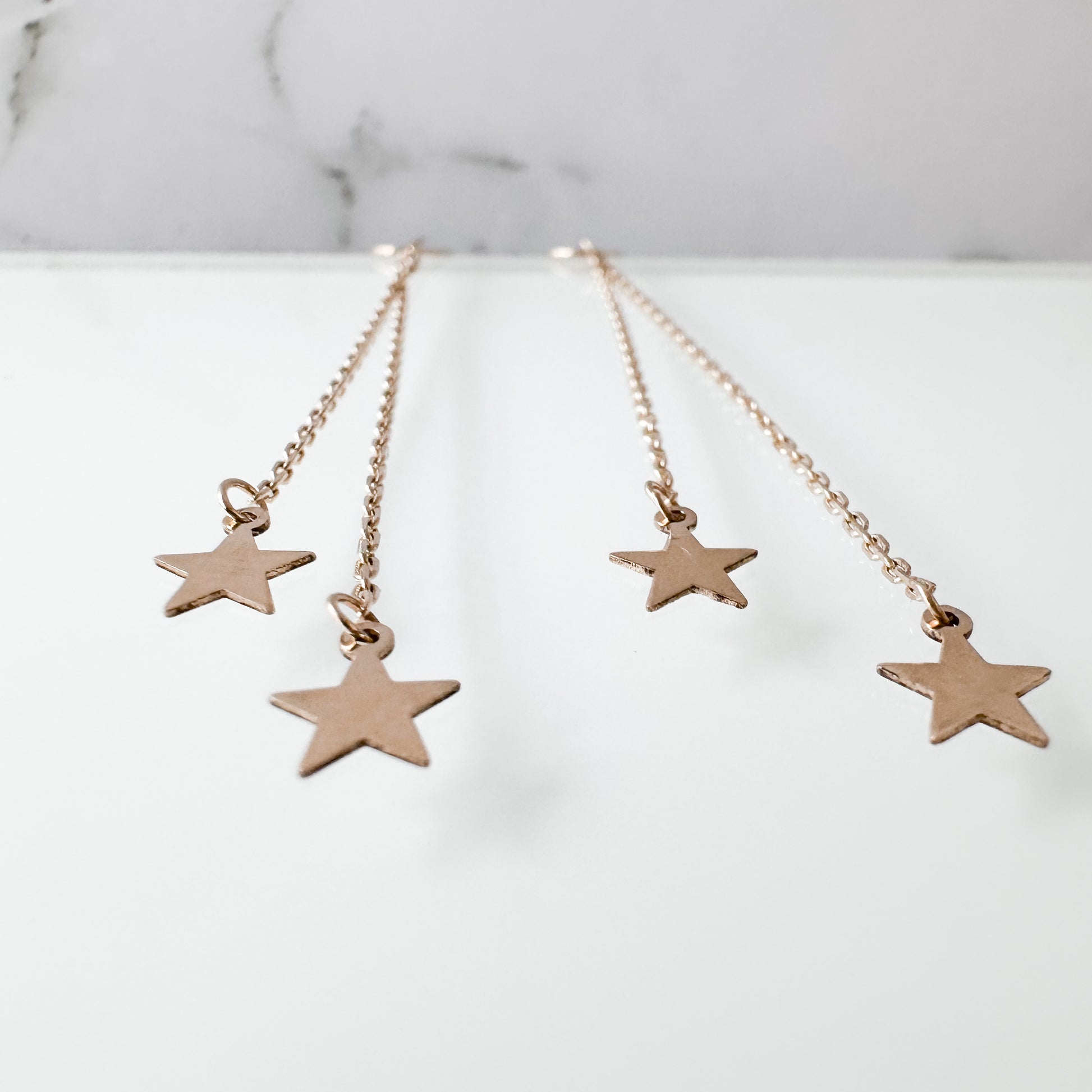 Elevate your style with our dazzling Earrings featuring two gold stars delicately suspended from a chain, creating a mesmerizing and eye-catching effect. These earrings are brimming with radiant glow and exude a unique personality, making them the perfect accessory to enhance your outstanding look. Crafted with meticulous attention to detail, they are made from high-quality materials to ensure both elegance and durability. Complete your ensemble with these extraordinary earrings that effortlessly combine charm, style, and a touch of whimsy.